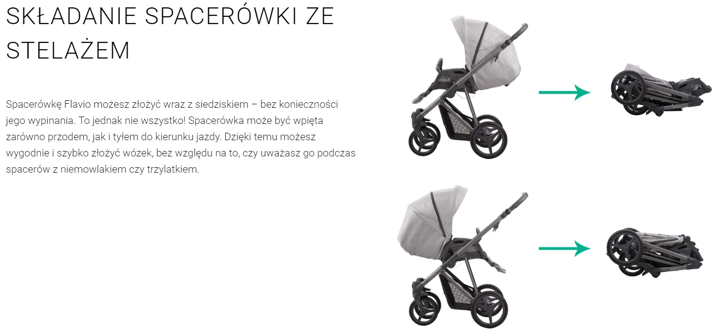 Siedzisko spacerówki możesz wpiąć przodem lub tyłem do kierunku jazdy, możesz je także złożyć wraz ze stelażem bez względu na kierunek wpięcia.