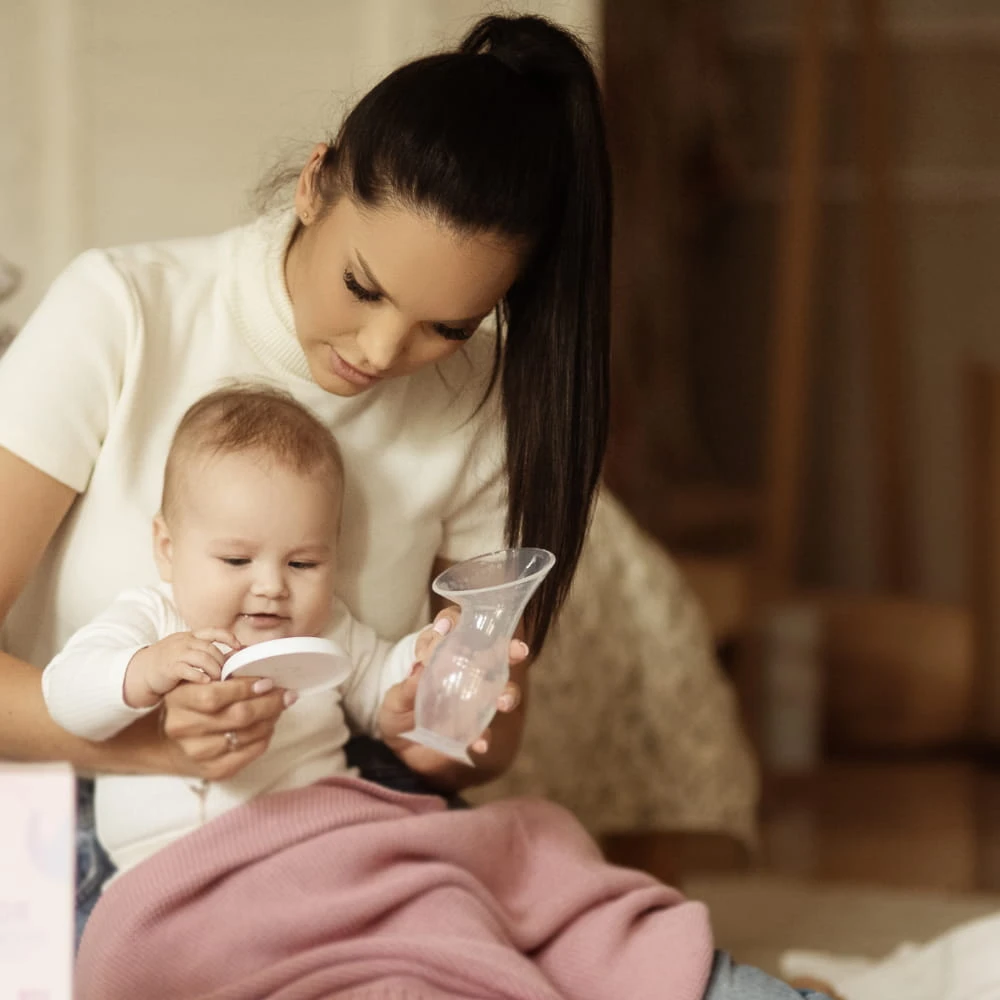 Zbiera wypływający pokarm podczas karmienia z 2 piersi | Ręczny laktator | Reguluje i wspiera laktację | Bezpieczny |100% silikonowy | Brak ryzyka stłuczenia i uszkodzenia | Wyprofilowany kształt lejka | Łatwy w użyciu | Można myć w zmywarce