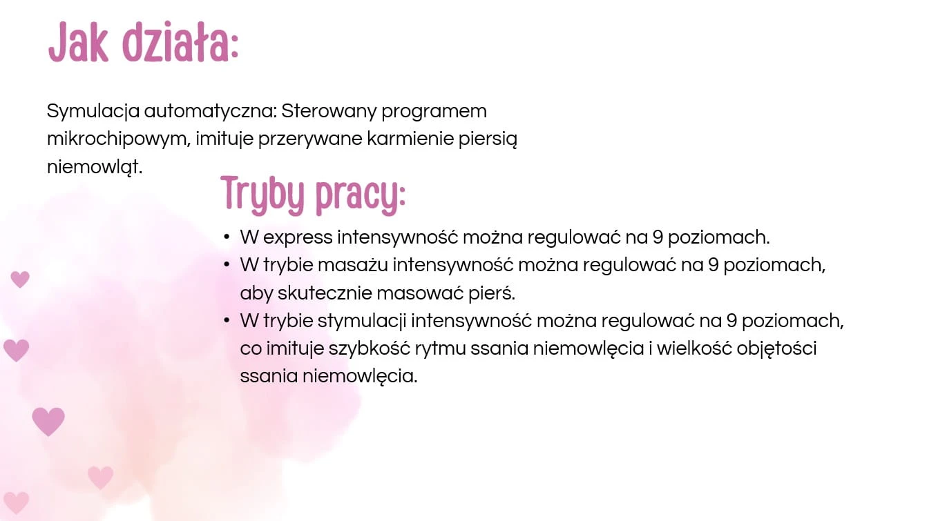 - Tryb ssania imituje rytm i intensywność ssania dziecka, można dostosować go do własnych preferencji, aby pobudzić lub zwolnić proces laktacji.