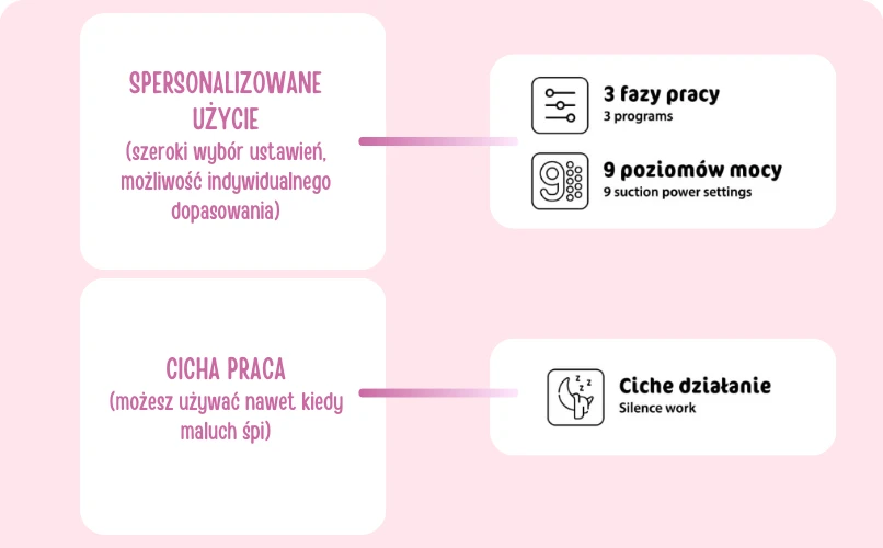 Najważniejsze jest to, że laktator jest bardzo cichy, co pozwala na korzystanie z niego w sytuacjach, gdy dziecko śpi lub jesteś w innym miejscu, nie zakłócając otoczenia.