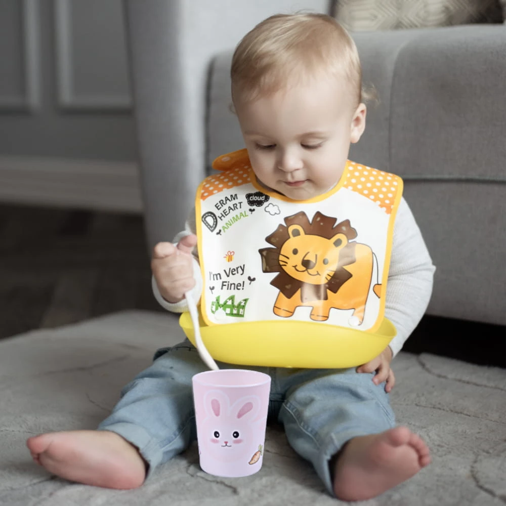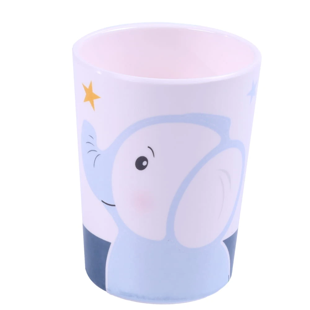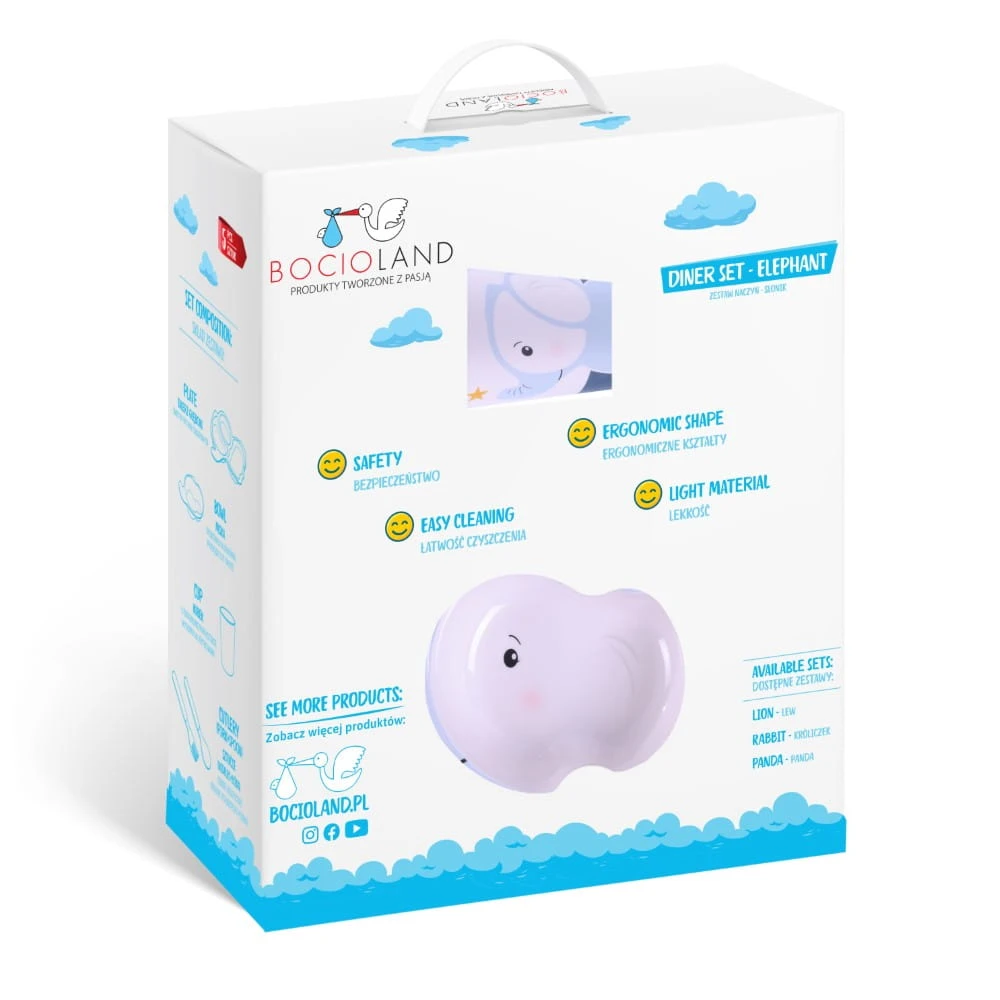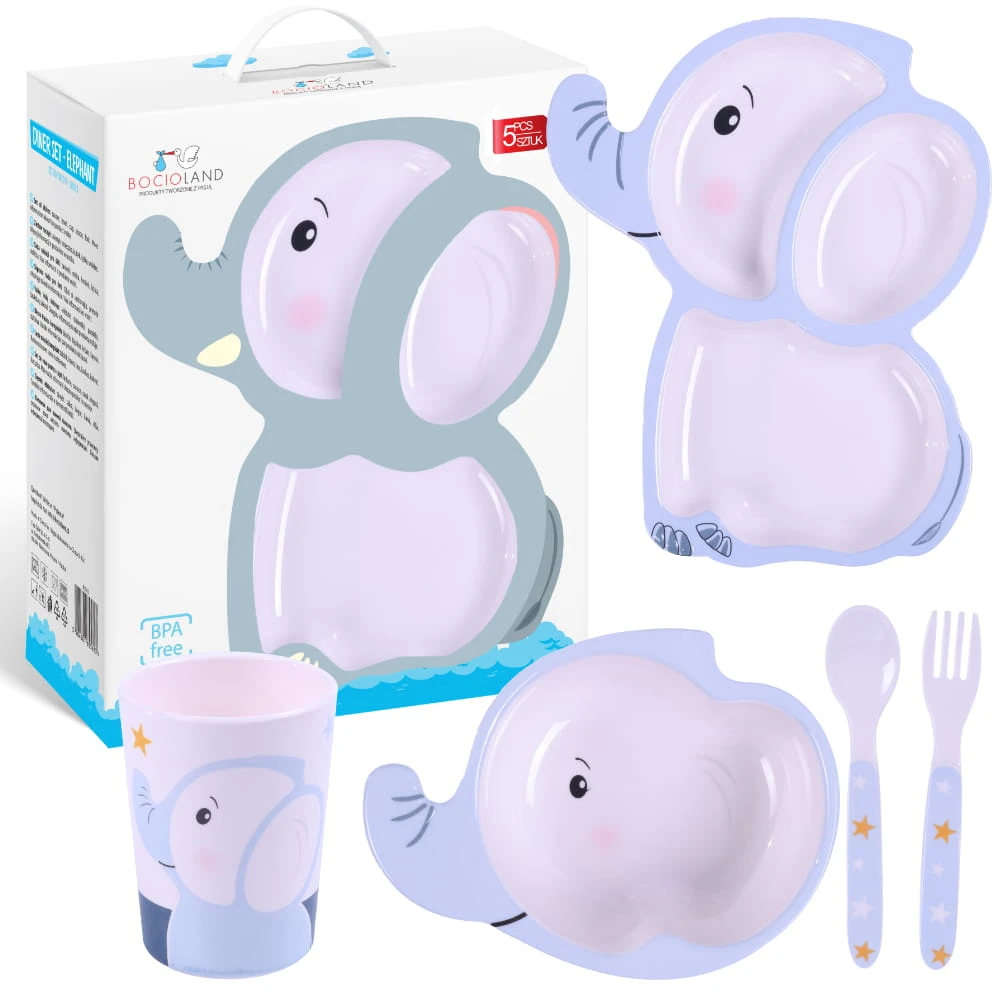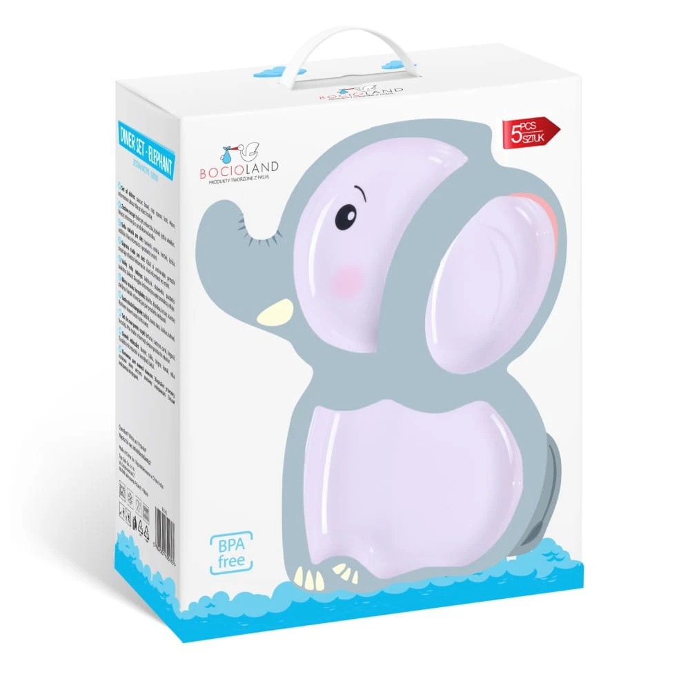 Wszystkie elementy ozdobione są uroczym motywem słonika, który zachęca dziecko do jedzenia i sprawia, że posiłek staje się przyjemniejszy.