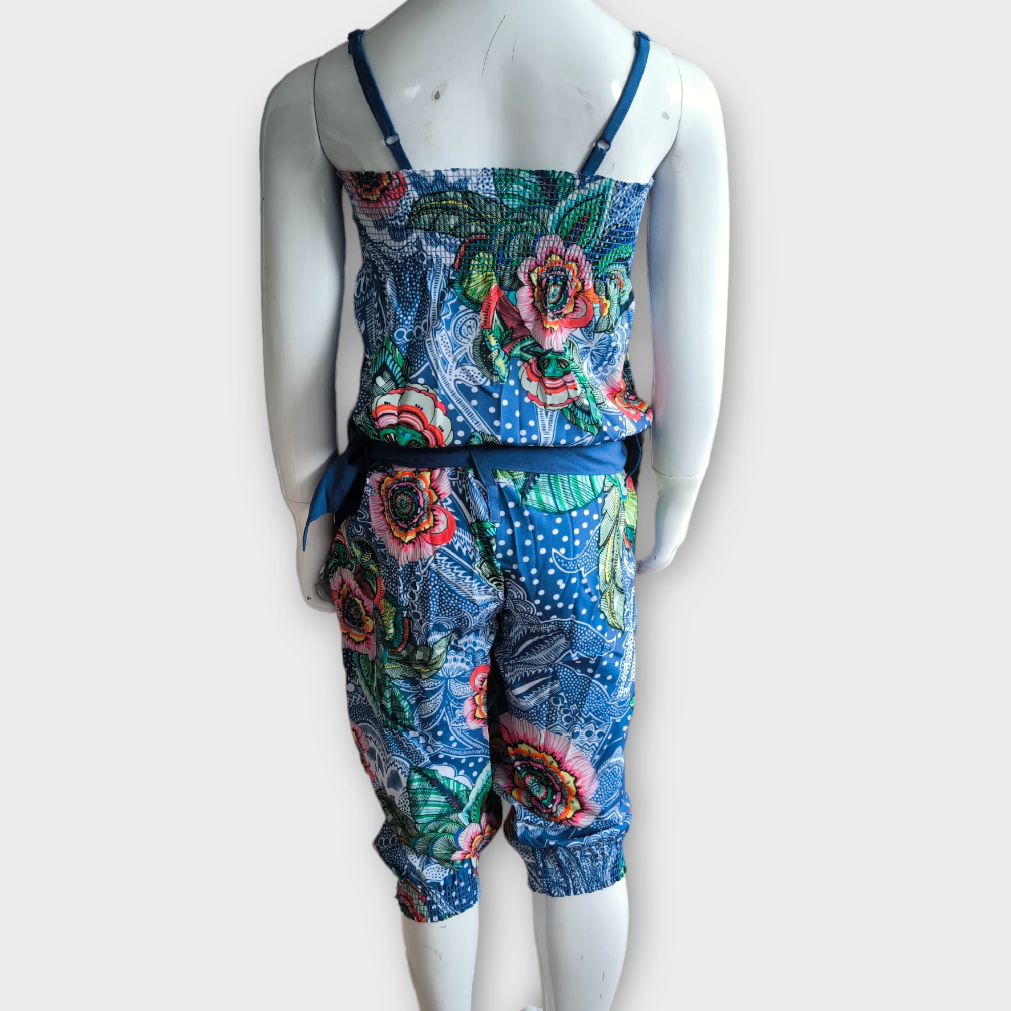 Prezentowany manekin ma 130cm wzrostu więc dla 3/4 letniej dziewczynki kombinezon będzie miał nogawki do stóp. Góra marszczona z gumkami. Styl - simbadki.