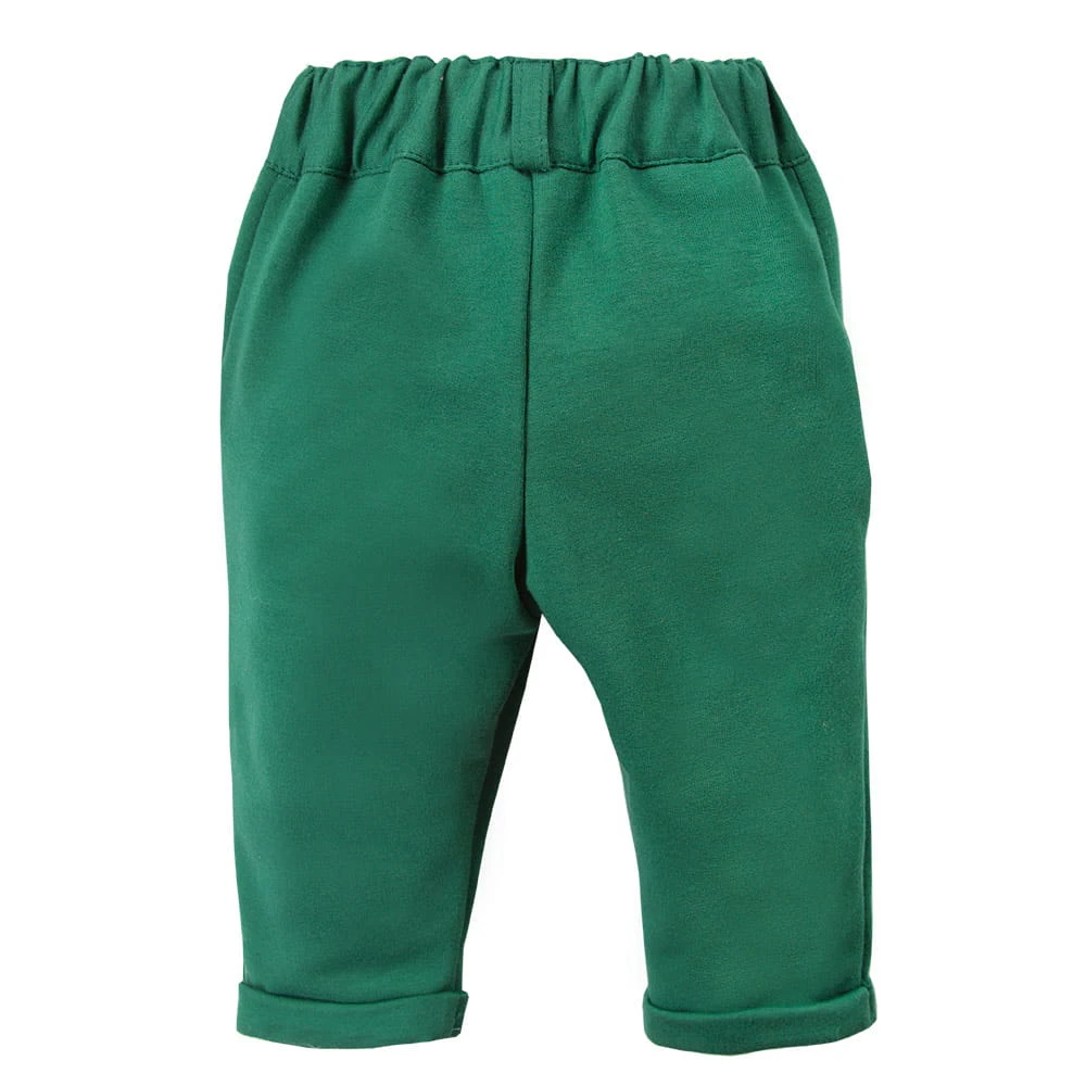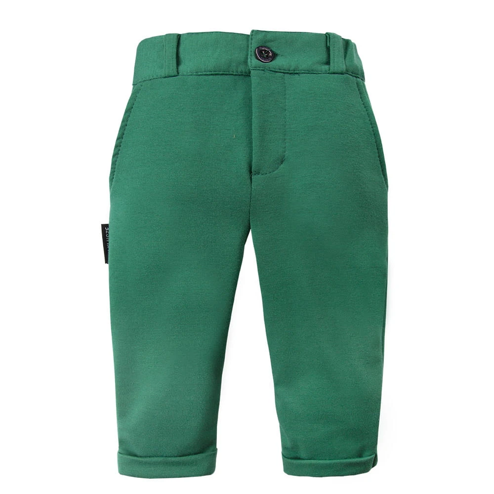 Spodnie chłopięce z kolekcji "Ceremony" wykonane z miękkiej i przyjemnej w dotyku dresówki. Zapinane na guziczek. Przy kieszonce znajduje się niewielka naszywka wykonana z eko skórki. Posiadają w pasie gumę nie uwierająca brzuszka dziecka. Nogawki posiadają mocowane wywinięcie. Wyprodukowane w Polsce, posiadają certyfikat "Bezpieczny dla dziecka". 100% bawełna