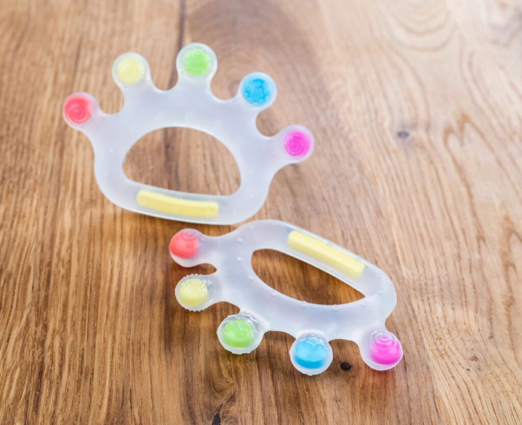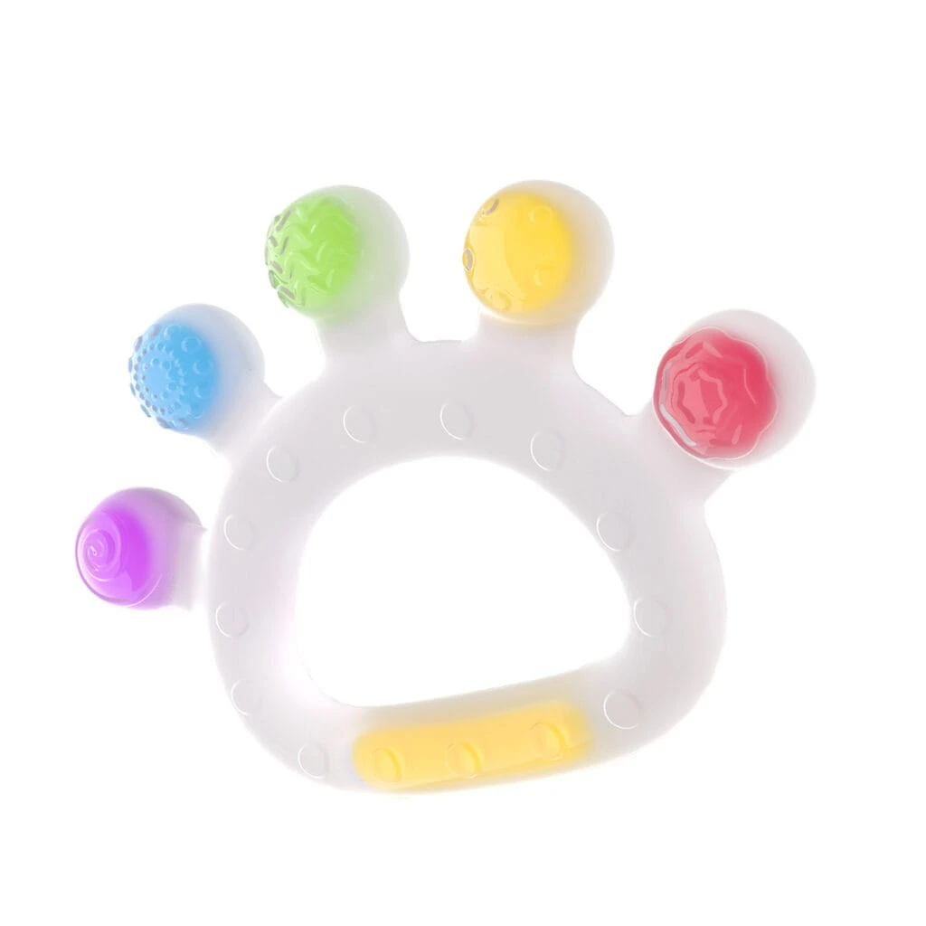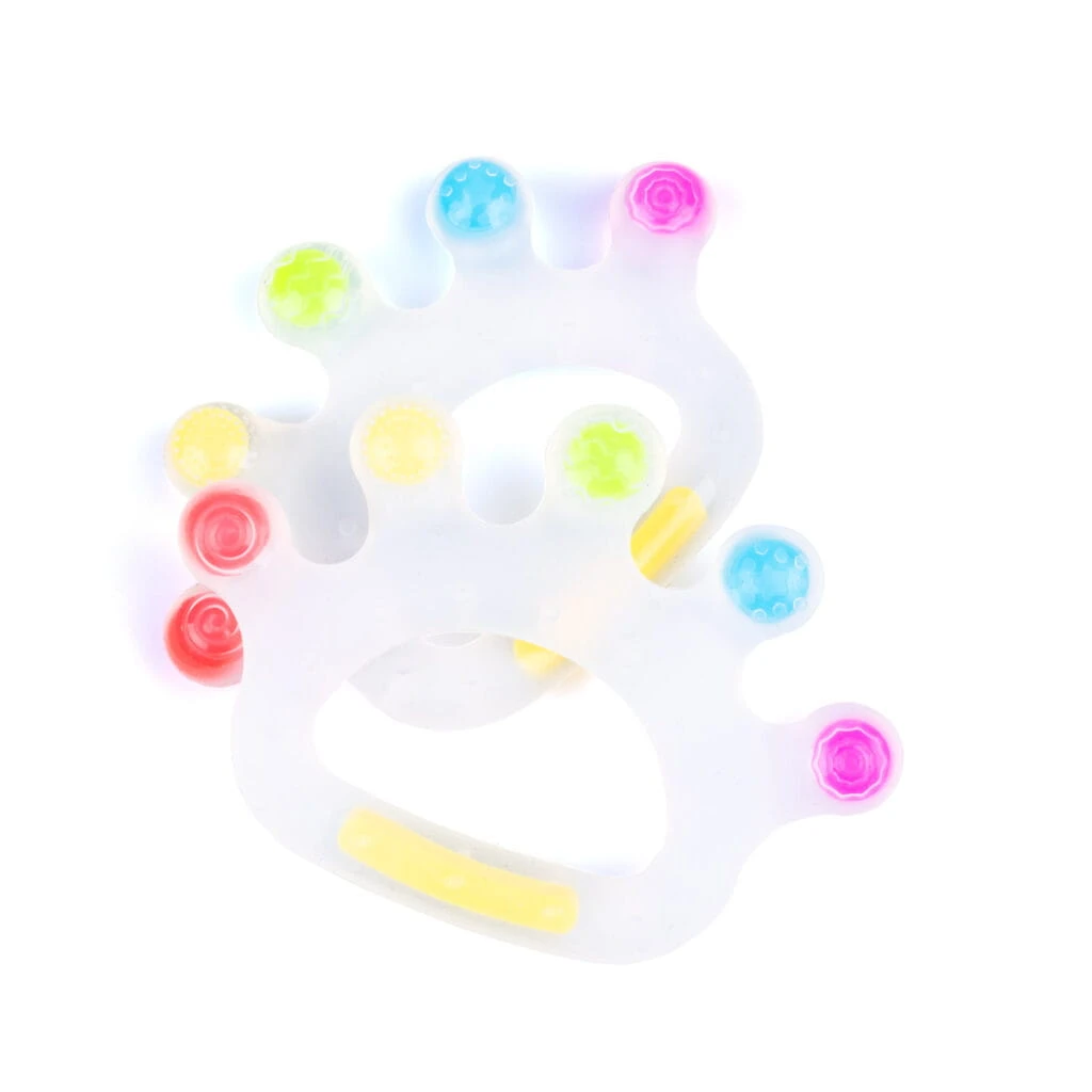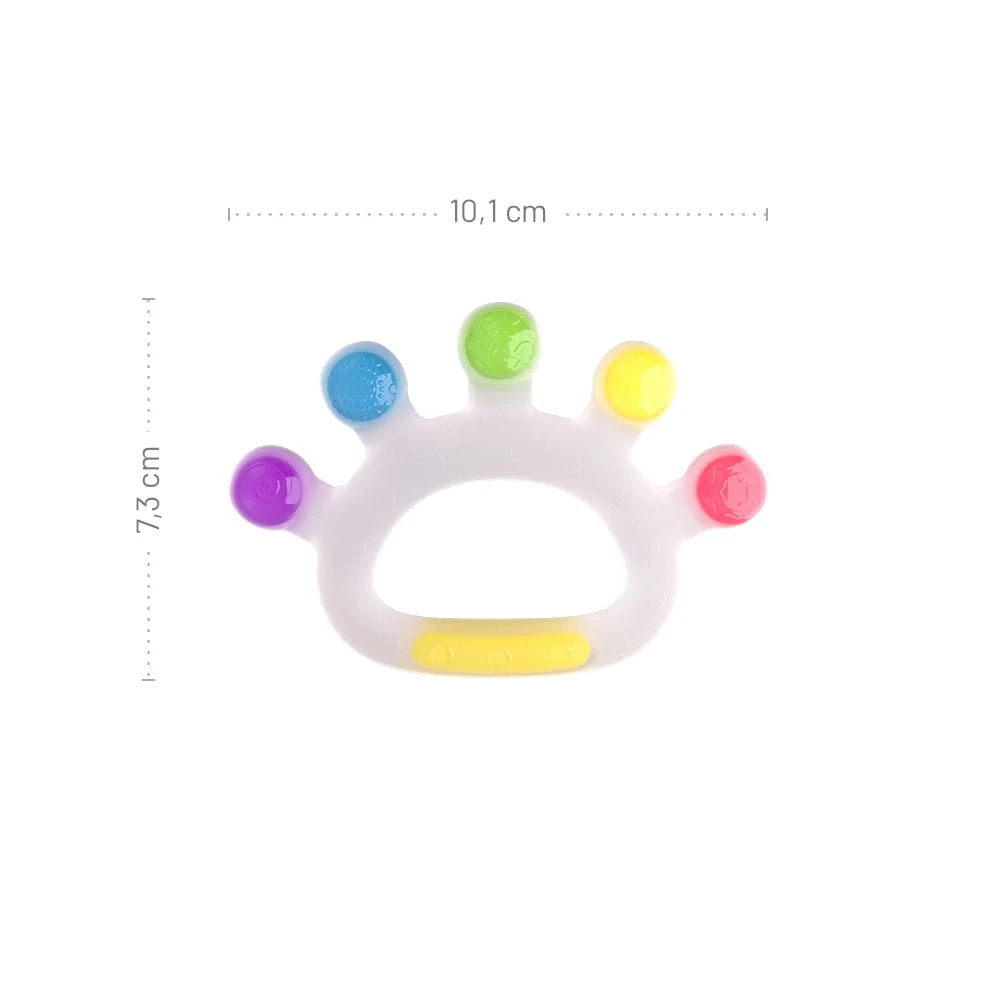 Kolorowy gryzaczek wykonany z bezpiecznego silikonu. Zdobią go wypustki o zróżnicowanym kształcie, dzięki czemu delikatnie masuje on opuchnięte dziąsełka, przynosząc maluchowi ulgę. Wygodny uchwyt jest idealnie dostosowany do małej rączki, co ułatwia chwytanie zabawki.