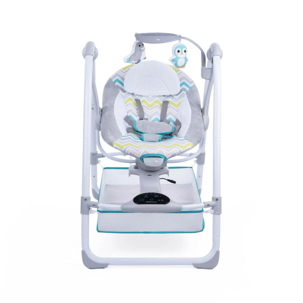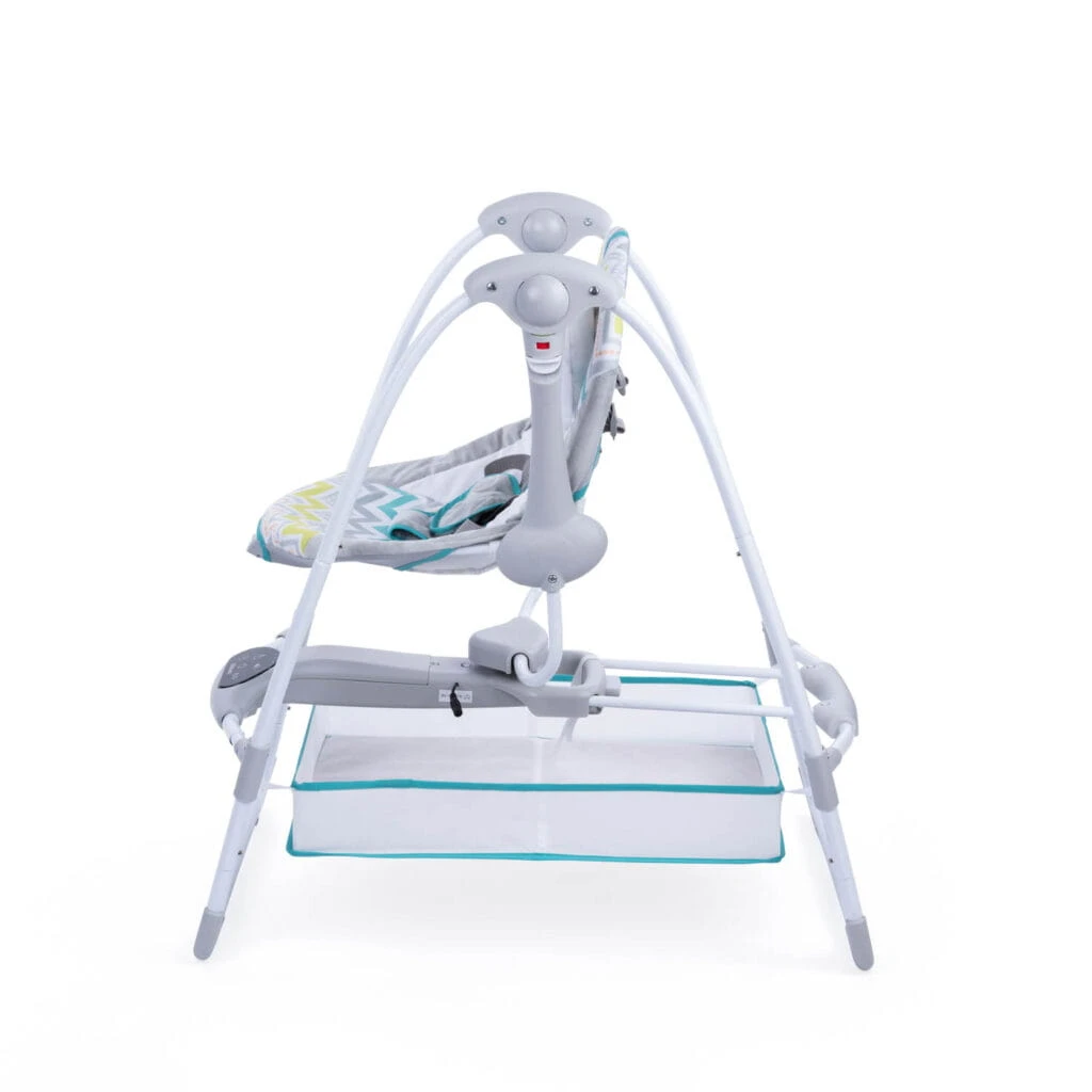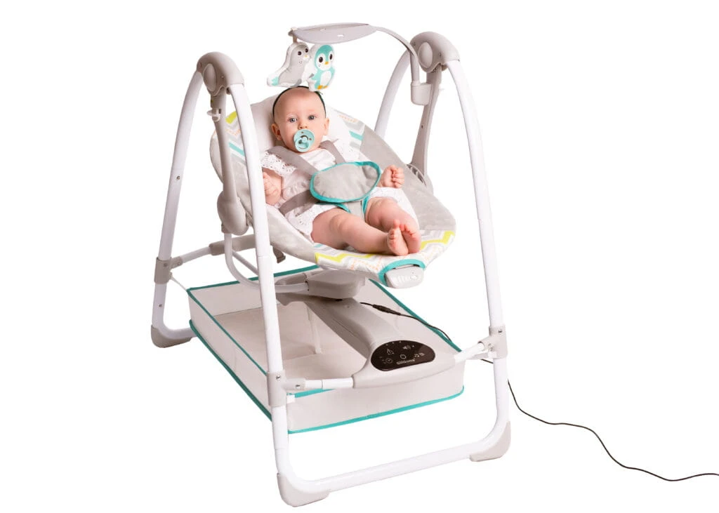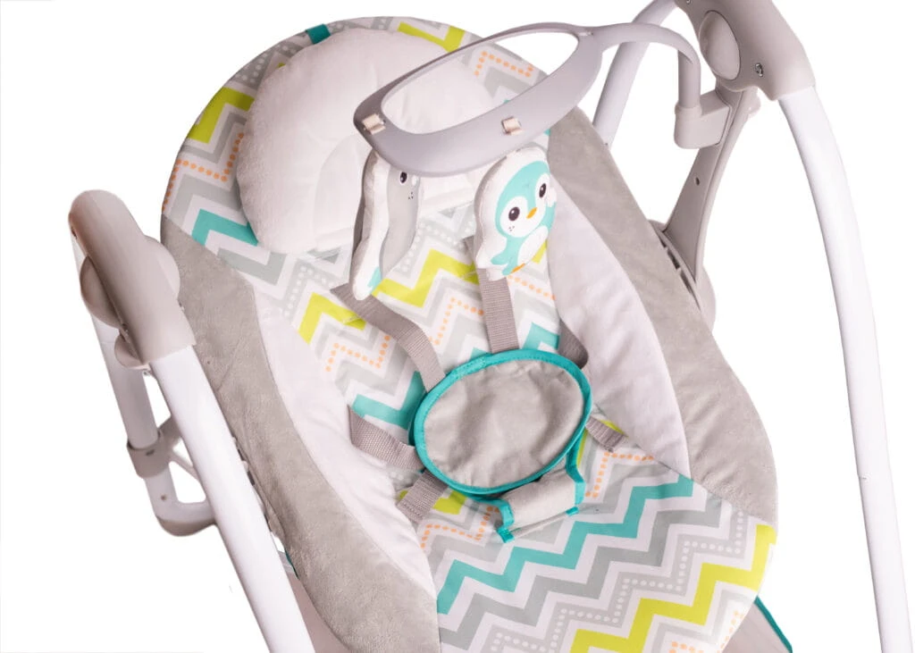 Komfortowa huśtawka, która kryje w sobie mnóstwo przydatnych funkcji. Znajdziemy tu odczepiany pałąk z zabawkami, pojemnik na najpotrzebniejsze drobiazgi, odczepiany zagłówek, funkcję wibracji i panel dotykowy, który odpowiada za uruchamianie melodii, sterowanie prędkością bujania i programowanie timera. Do wyboru mamy 3 różne nastawy czasowe, dzięki czemu w łatwy sposób dostosujemy huśtawkę do indywidualnych potrzeb maluszka. Blokada bujania umożliwi korzystanie z huśtawki w trybie statycznym, a antypoślizgowe nóżki i 5-punktowe pasy zadbają o bezpieczeństwo dziecka. Możliwość złożenia huśtawki na płasko ułatwia jej przechowywanie oraz przenoszenie. W zestawie znajduje się adapter, umożliwiający podłączenie Swing TuliLuli Deluxe do prądu. Funkcja zasilania bateryjnego pozwala skorzystać z huśtawki wszędzie tam, gdzie nie mamy dostępu do zasilania sieciowego.