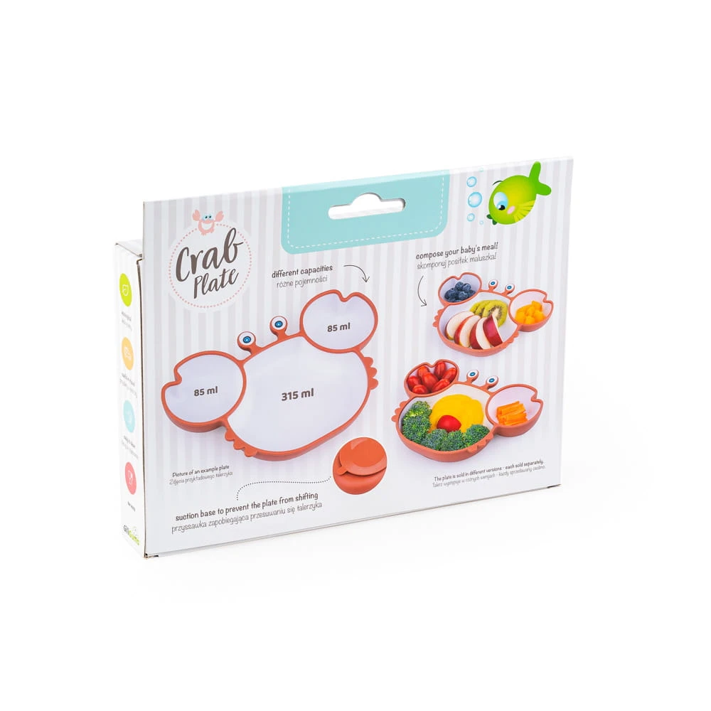 Oto uroczy krab, który uczyni każdy posiłek jeszcze zabawniejszym! Ten radosny talerzyk zachęci maluszka do samodzielnego jedzenia, stawiając pierwsze kroki w kulinarnej przygodzie. Z trzema praktycznymi przegrodami, łatwo podzielisz składniki posiłku, co ułatwi maluchowi odkrywanie różnych smaków i konsystencji potraw. Talerzyk posiada również przyssawkę, która skutecznie zapobiega przypadkowemu przemieszczaniu się podczas posiłku.