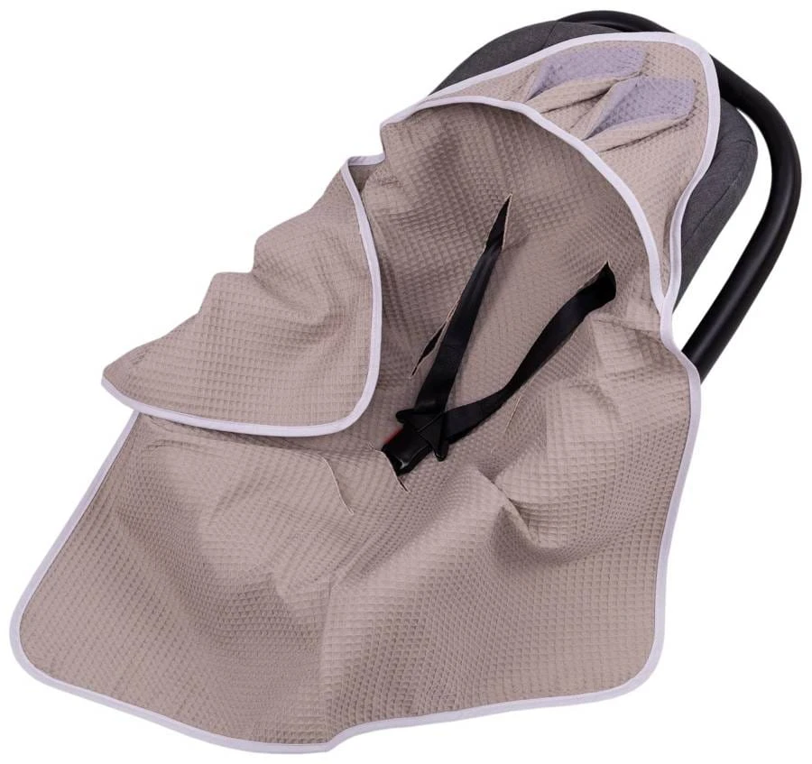 Miękki, delikatny, jednowarstwowy kocyk z kapturkiem uszyty z bawełny o strukturze wafelka. Idealnie pasuje do nosidełka lub fotelika samochodowego. Świetnie sprawdzi się podczas wiosennych i letnich spacerów i podróży.