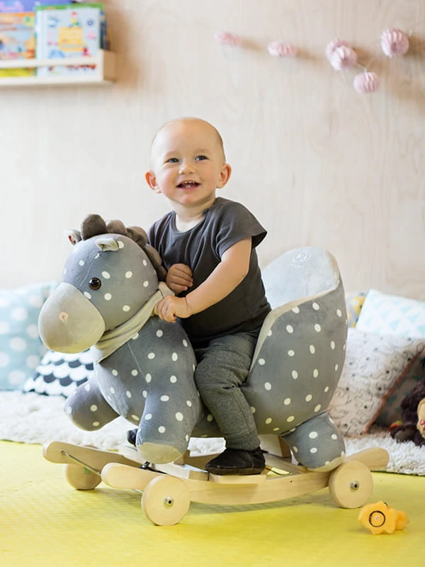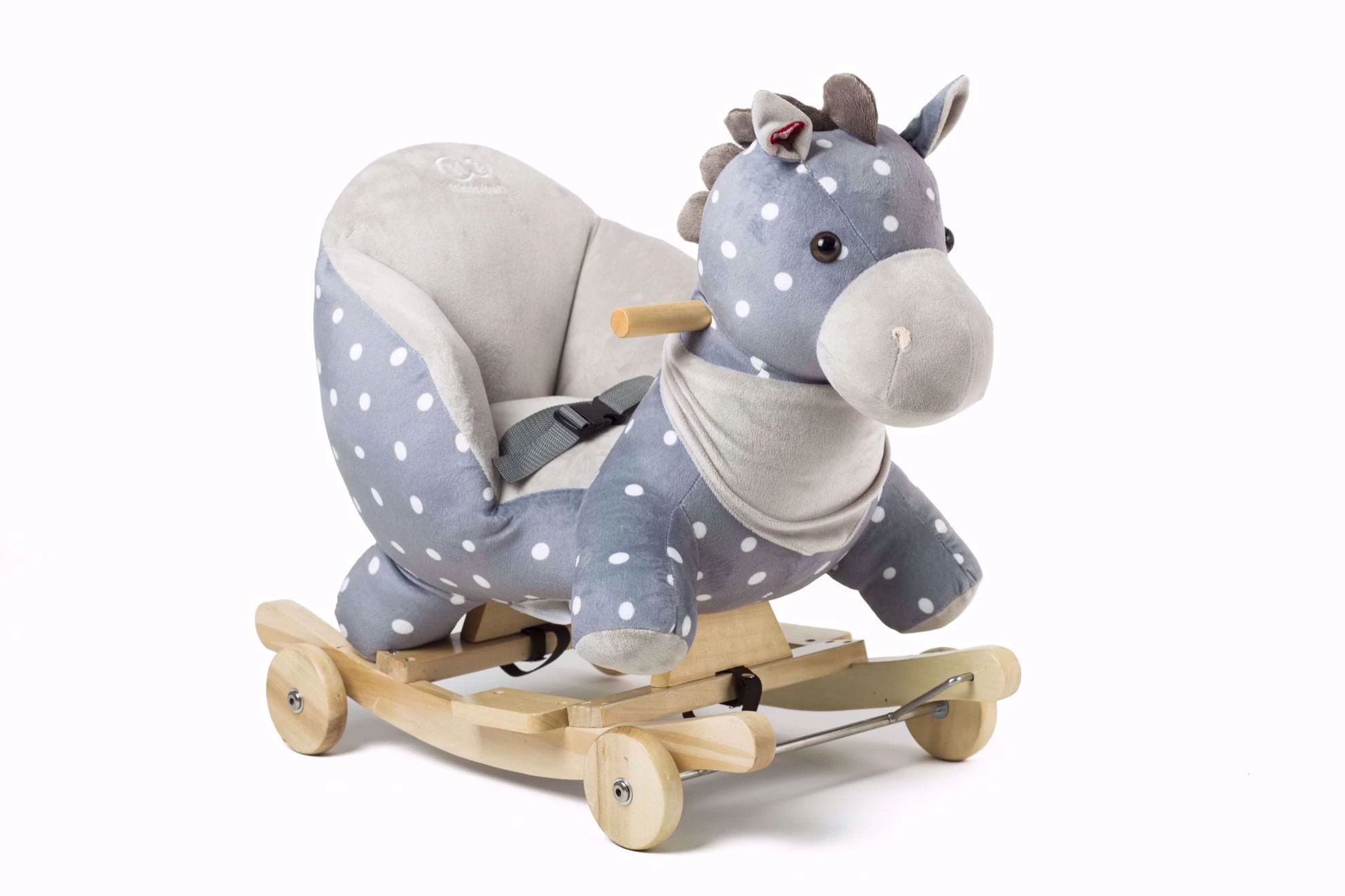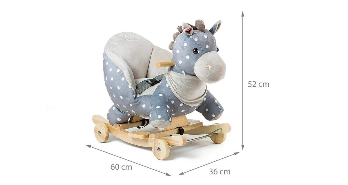 2w1 - bujak i jeździk z efektami dźwiękowymi. Płozy wyposażone są dodatkowo w drewniane kółka, które można szybko przekładać pod płozy i zamieniać bujak w jeździk.