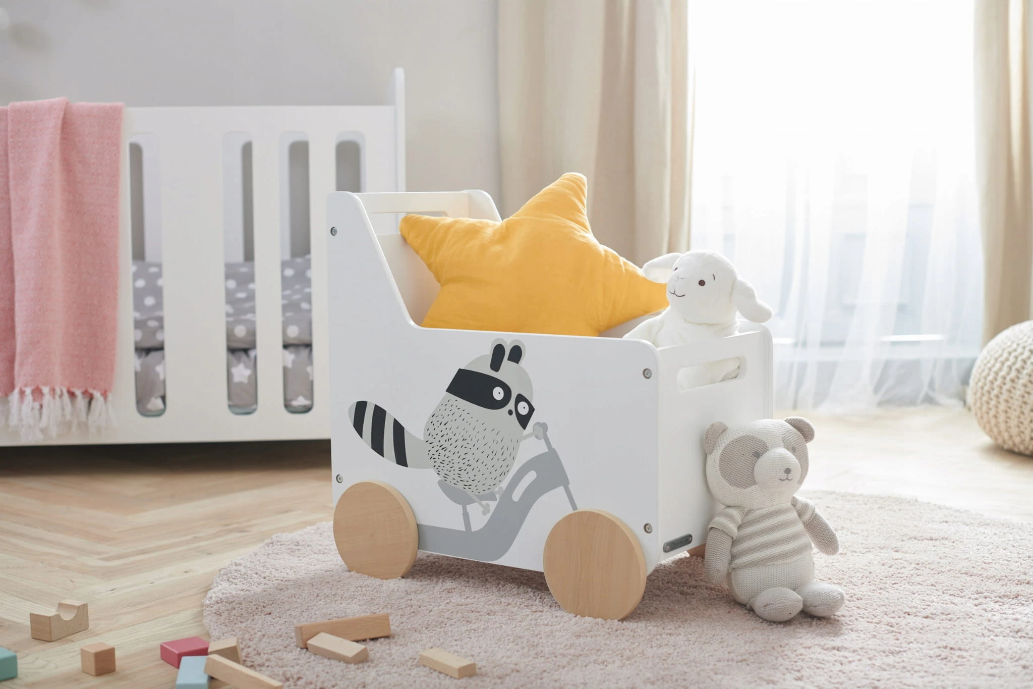 Skrzynia na zabawki RACOON to stylowy element wyposażenia dziecięcego pokoju i idealne rozwiązanie dla mam, które lubią kiedy przedmioty mają swoje miejsce. Ma dużą pojemność i obciążenie do 20 kg, dzięki czemu może mieć bardzo wiele zastosowań. Nada wnętrzu pokoiku dziecięcego charakteru, ale będzie pasować także do salonu. Uroczy szop z boku skrzyni spodoba się każdemu fanowi małych zwierzątek, a kształt wózka pobudzi wyobraźnię i będzie pretekstem do zabawy. Skrzynię łatwo przeniesiesz z pokoju do salonu, ponieważ wyposażona jest w wygodne uchwyty.