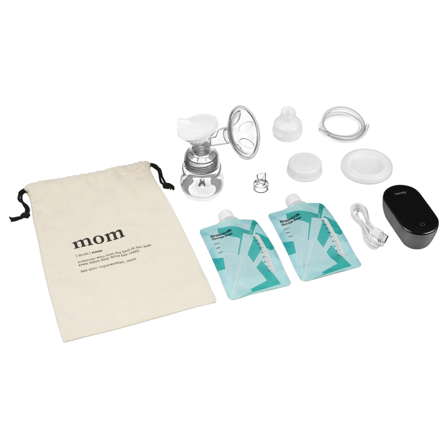 Urządzenie jest lekkie i poręczne, więc bez problemu zmieścisz je w swojej torebce. W zestawie otrzymasz laktator Lionelo Fidi Go, butelkę do mleka (150 ml) ze smoczkiem, dwie torebki do przechowywania pokarmu, lejek z pokrywką, kabel USB i bawełniane etui — niezawodne w podróży!
