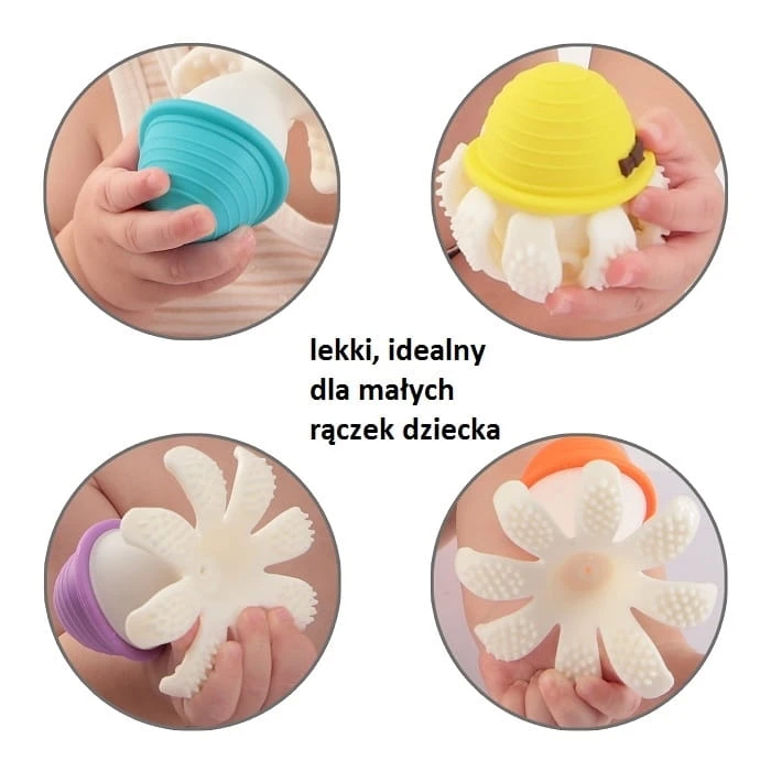 Silikonowy gryzak 3D zaprojektowany tak, aby dziecko nie miało możliwości zadławienia się. Urocza ośmiorniczka może być ulubionym przyjacielem w czasie ząbkowania. Jej konstrukcja zapewnia dziecku wiele sposobów na zabawę. Gładka powierzchnia może posłużyć do ssania, można zrobić z niej kulkę. Osiem macek wyposażone w wypustki posłużą zarówno jako gryzak oraz szczoteczka do zębów. Odpowiedni kształt i rozmiar umożliwiają dziecku łatwe jej chwytanie. Można używać go w zmywarce, mikrofalówce, a także zamrażarce. Ośmiorniczka zapakowana w przeźroczyste, sztywne opakowanie, będzie idealnym prezentem.
