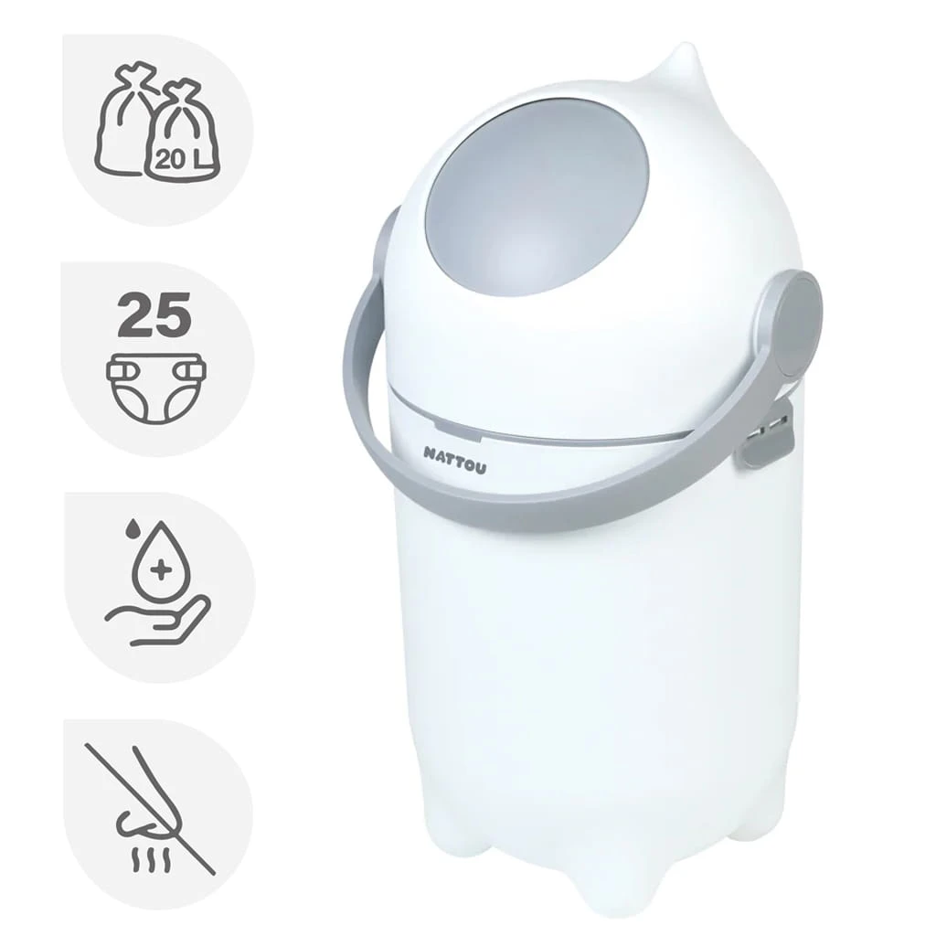 Zapewnij świeżość w pokoju dzięki koszowi na pieluchy Dropy. Jego obsługa jest wyjątkowo wygodna i możliwa jedną ręką – wystarczy podnieść uchwyt, wrzucić pieluchę do kosza, a następnie opuścić uchwyt, aby pielucha wpadła do wewnętrznej komory. Specjalny system zamykania skutecznie zapobiega wydostawaniu się nieprzyjemnych zapachów.
