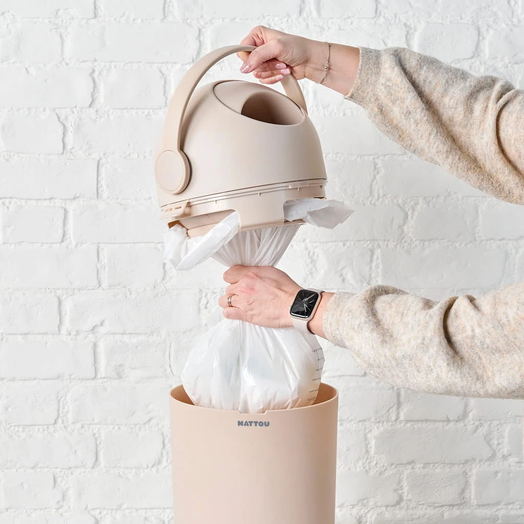 Zapewnij świeżość w pokoju dzięki koszowi na pieluchy Dropy. Jego obsługa jest wyjątkowo wygodna i możliwa jedną ręką – wystarczy podnieść uchwyt, wrzucić pieluchę do kosza, a następnie opuścić uchwyt, aby pielucha wpadła do wewnętrznej komory. Specjalny system zamykania skutecznie zapobiega wydostawaniu się nieprzyjemnych zapachów.