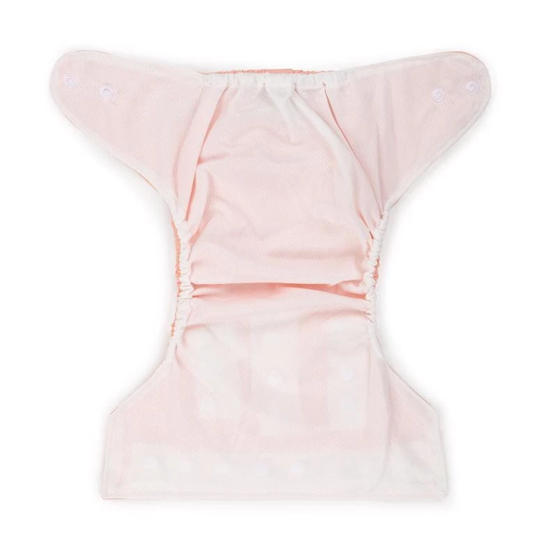 Miękki materiał zewnętrzny jest szczelny i oddychający, nie pozwala wydostać się zawartości pieluszki na zewnątrz. Wewnętrzna część wykonana jest z siateczki. Po odpięciu pieluszki można rozłożyć ją na płasko, co ułatwia założenie wkładu chłonnego oraz umożliwia wygodne przewinięcie malucha.