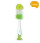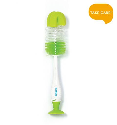 Szczotka z przyssawką „SAMOSTOJĄCA” pomaga w dokładnym czyszczeniu zarówno butelki, jak i smoczka. Szczotka posiada przyssawkę, która umożliwia przyczepienie jej do płaskich powierzchni, dla ułatwienia osychania. Szczotka do butelki jest zakończona miękką gąbką, która dostosowuje się do kształtu butelki. W uchwycie rączki jest schowana mała szczotka do czyszczenia smoczka. Miękkie włosie szczotek i gąbka docierają do trudno dostępnych miejsc. Szczotki wykonane są z trwałych i bezpiecznych materiałów, nie zawierających Bisfenolu A.